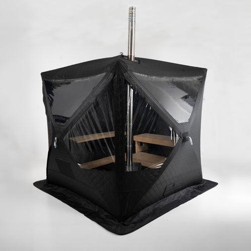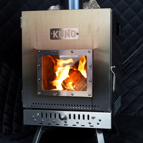 KUNO er det eneste bastuteltet med panoramavinduer over ovnen – så du kan nyte flammene og naturen samtidig.